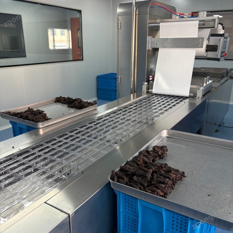 2. 全自動拉伸膜包裝機,自動裝填:產(chǎn)品(如棗仁派、肉塊、熟食)被自動或人工放入成型好的凹槽中。